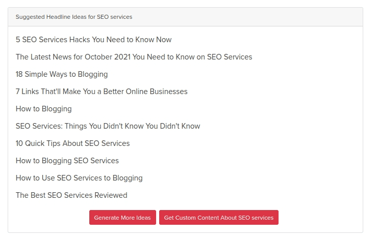 Click the red button when everything is ready and in seconds you'll get a list of 10 possible titles. You can continue clicking "Generate More Ideas" to refresh your list or check out our HOTH Blogger product to get help with generating killer content for your site.