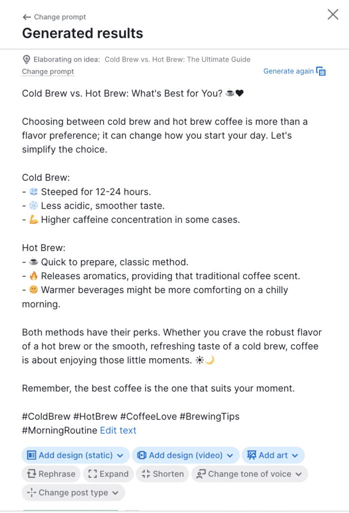 The post will automatically be tailored to your brand, including your unique brand voice. Also, you have the option to add your own spin to the generated copy to give it your own personal touch. As a bonus, the AI-powered writing assistant can rephrase or rewrite any original text to ensure it’s on point.