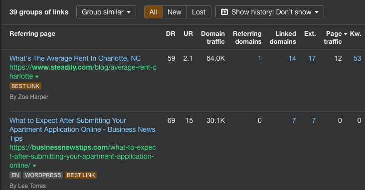 As you can see, both links appear on reputable real estate news sites, and they have high domain ratings (DR, which is scored on a range of 1 – 100).