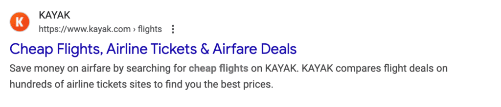 In this example, kayak.com used keywords that are commonly searched when looking for flights including brand names. They also mentioned related terms like "deals" and "best price" to give the searcher a reason to click the search result.
