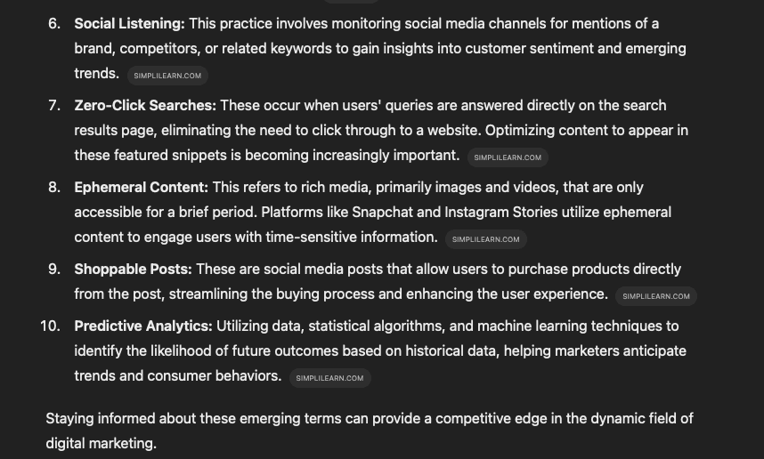 Let’s use a tool like ChatGPT to illustrate what we mean. For this example, we’ll stick with the digital marketing niche. Here’s what happens when we ask ChatGPT to give us some lesser-known digital marketing keywords that are rising in popularity: