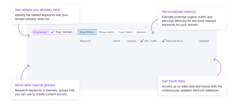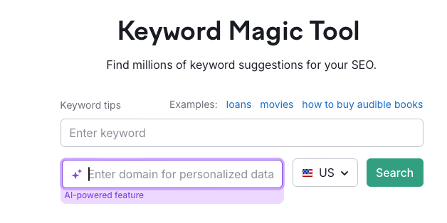 Semrush is a leading SEO platform that’s been adding innovative AI features all the time. One such example is its Keyword Magic tool, which has a new AI-powered twist. Instead of entering generic seed keywords as you would with a traditional research tool, you can add your domain to see personalized insights generated by AI.