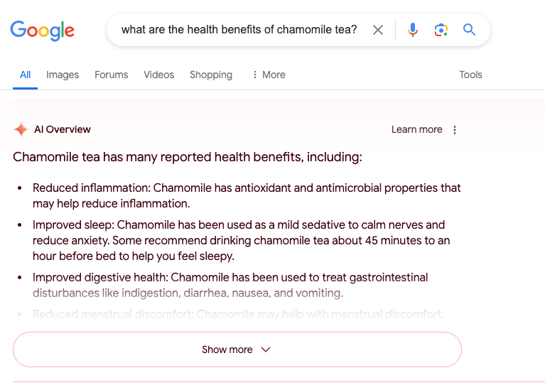 Lots of informational queries now trigger AI Overviews, and it’s pretty clear why. Gemini can provide direct answers to common questions, which are what most informational keywords consist of. If you’re looking to educate yourself about a topic or answer a question, don’t be surprised if an AI Overview pops up. Here’s what happens when we search for the health benefits of chamomile tea: