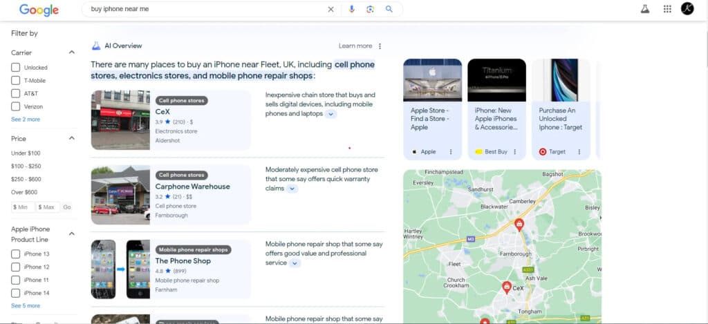 Searches with commercial intent mean the user is interested in making a purchase but wants to weigh their options first. These types of queries can trigger AI Overviews that provide detailed information about what the user wants to purchase. The Overview also cites several online resources and includes a brief description of each. Here’s an AI Overview that was generated for a user searching for iPhones near their location in the UK: