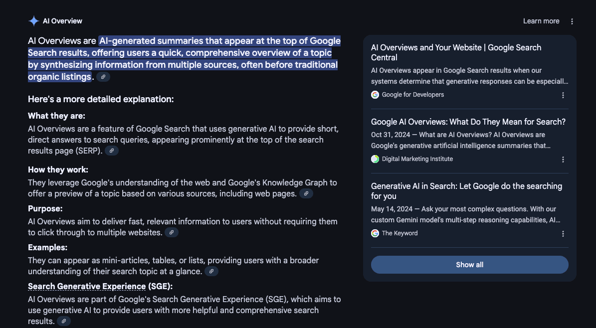 Namely, AI Overviews pull information from multiple sources and then generate an original response.