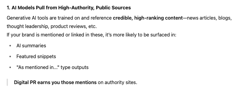 reat read! I hadn’t considered how much AI tools like ChatGPT and Perplexity rely on authoritative sources when generating content. The idea of using digital PR to boost brand visibility in AI-driven search results is spot on. It’s a smart reminder that backlinks and media mentions aren’t just good for SEO—they’re now essential for AI relevance too. Thanks for the insights!
