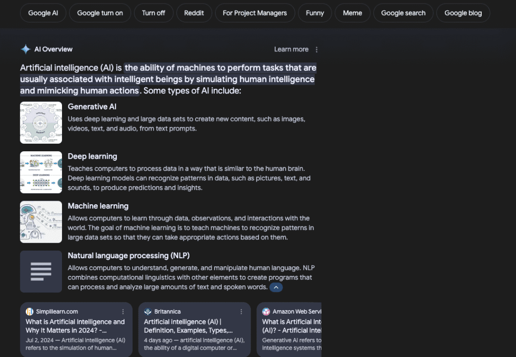 Also, note that in the AI Overview provided above, 2 of the 3 provided sources are blog posts. If a user truly wanted to educate themselves on AI, the brief description provided by Google wouldn’t fully scratch their itch.