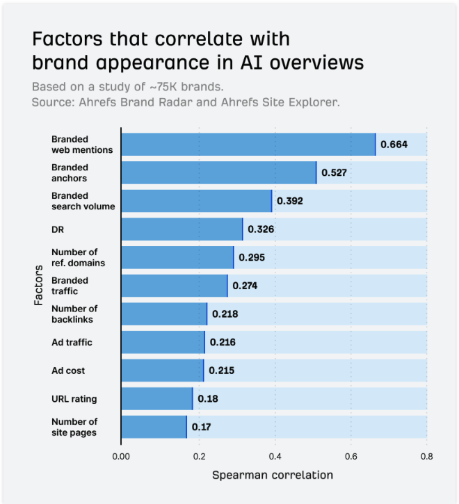 A study by Ahrefs found that the three most important AI visibility factors were brand mentions, branded anchors, and branded search volume:
