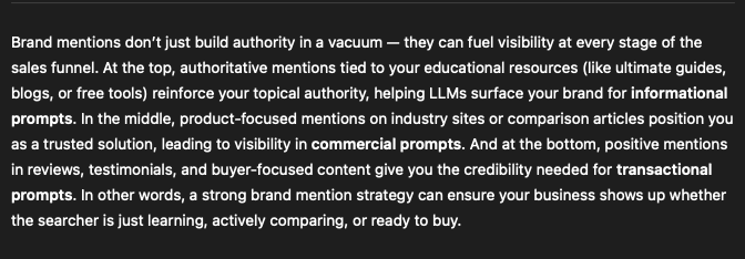 To reiterate, brand mentions are an absolutely crucial trust signal in AI search. They improve visibility, reinforce entity recognition, and increase the likelihood that AI search tools will cite your content and recommend your products.
