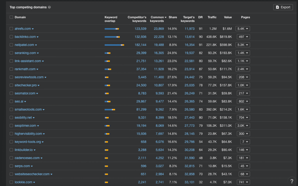 Here, you’ll get to see not only a list of your top competitors but also helpful data about keyword overlap, including how many keywords you share in common.