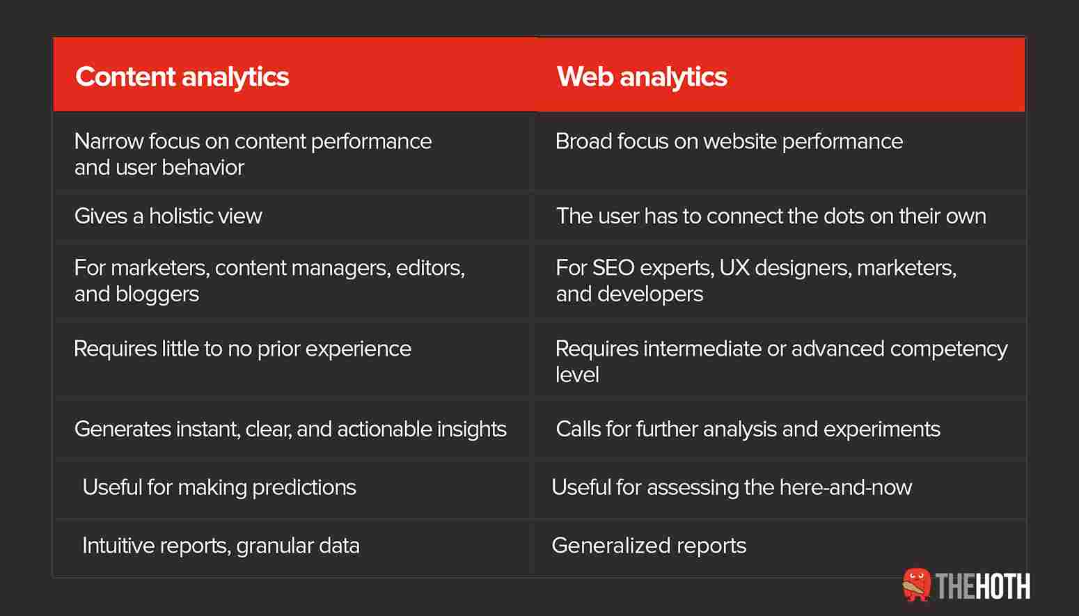 Content analytics isn’t synonymous with web analytics — they are two slightly different processes that complement each other. Let’s compare them to see the differences more clearly: