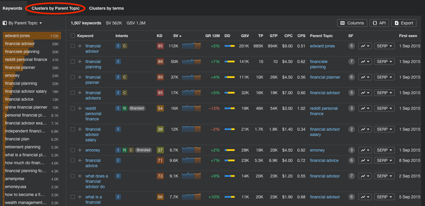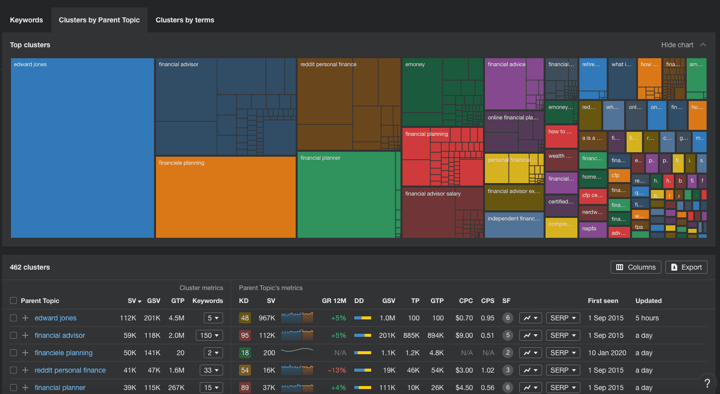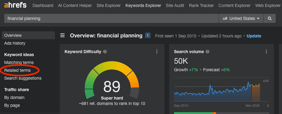 Next, you need to research keywords that are directly related to your pillar pages. You can use our free keyword research tool to make this happen, but subscription-based platforms like Ahrefs and Semrush will also work (if you have the budget). In particular, Ahrefs has some useful features for finding keyword clusters. Head to its Keyword Explorer tool and enter one of the topics you brainstormed from step #1 (we’re using financial planning for this example):