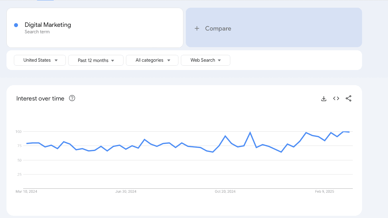 First, you need to uncover fresh topic ideas for content clusters, and there are multiple ways you can do this. One of our favorite methods is to use Google Trends to discover what our target audiences are searching for at the moment. This helps us develop content clusters that we know our audiences are interested in. For example, you can start by entering a general industry term related to your niche, like ‘digital marketing’: