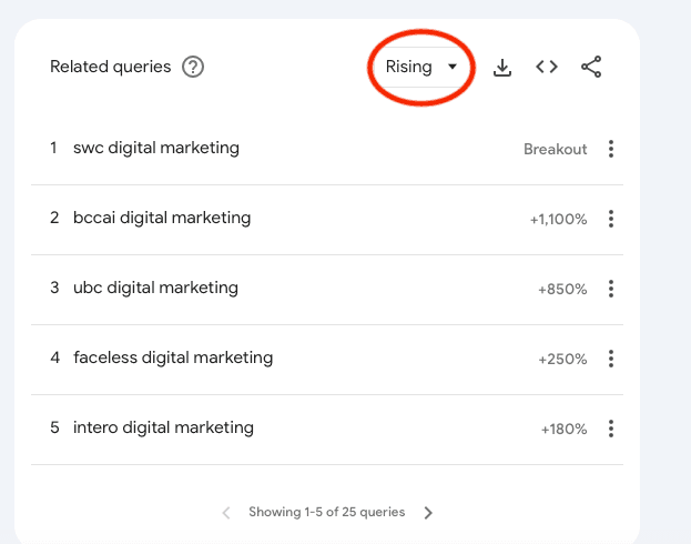 If you set this to Rising, it will show related terms that are increasing in popularity, making them viable topics for content (and clusters).