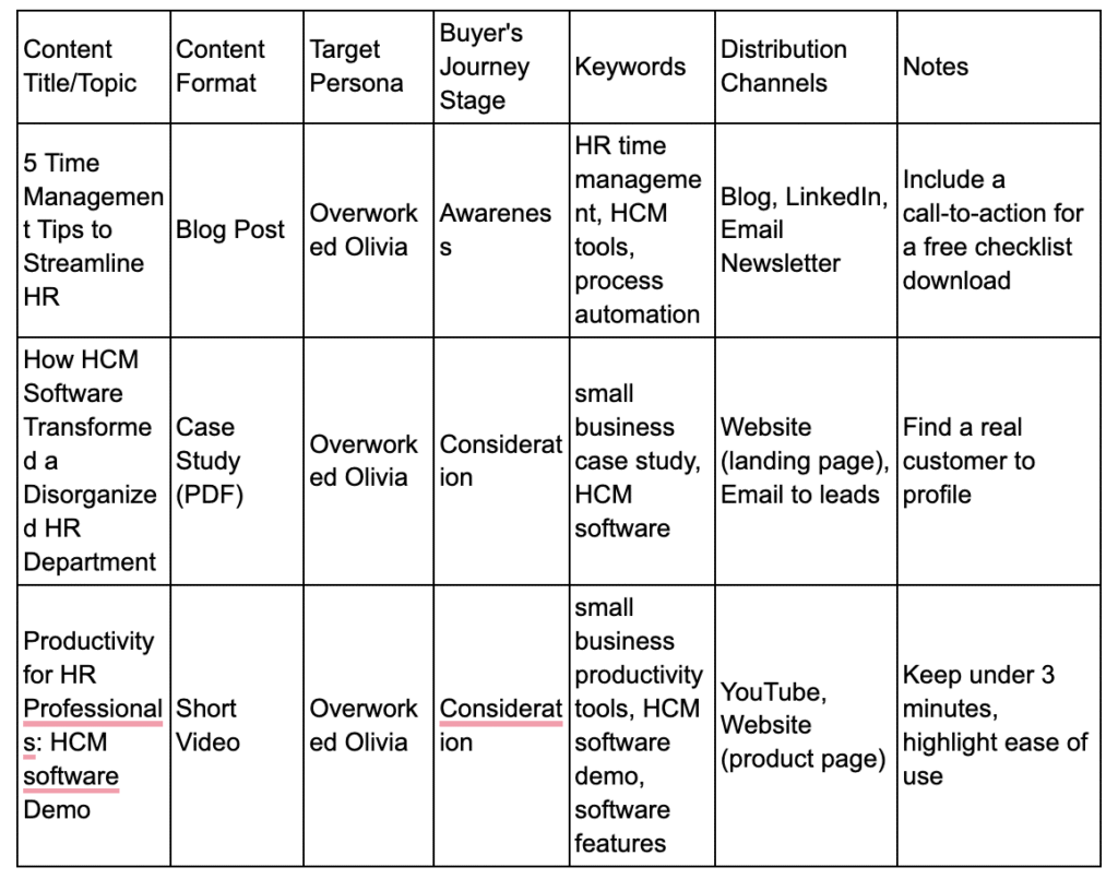 Here’s how you can map out content for Olivia during each stage of her buyer’s journey: