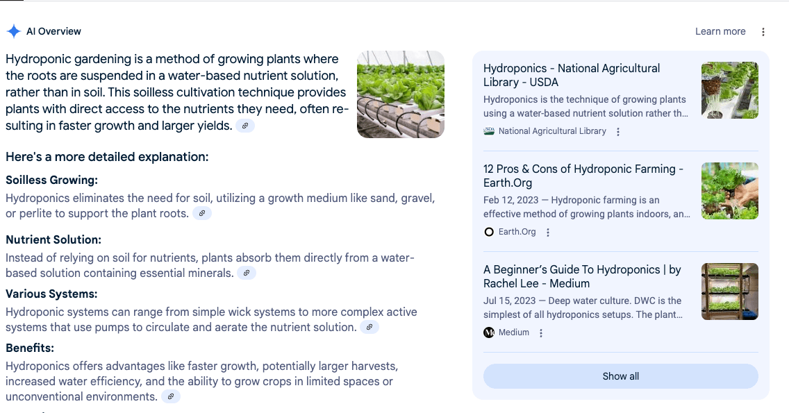 Imagine that you wanted to learn what hydroponic gardening is, so you type it into Google. Most of the time, this is an opportunity for websites selling gardening equipment to generate clicks by publishing content like ‘Understanding Hydroponic Gardening.’ This allows brands to A) inform their audience and be a helpful resource and B) market their products to relevant prospects. While this is still a great technique (it’s inbound marketing 101), AI Overviews are hindering the visibility of informative, top-of-the-funnel content (TOFU) like this. Here’s what happens if we search for ‘what is hydroponic gardening’ on Google now: