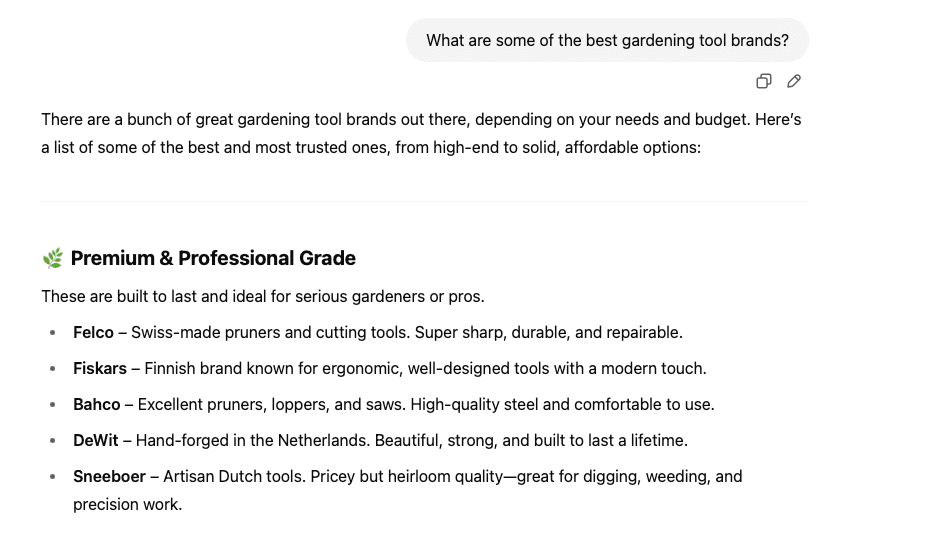 A new type of search optimization is emerging called GSO (generative search optimization). It’s the practice of improving your brand’s visibility in generative AI (GAI) responses. For example, whenever people ask ChatGPT about products, it always provides recommendations: