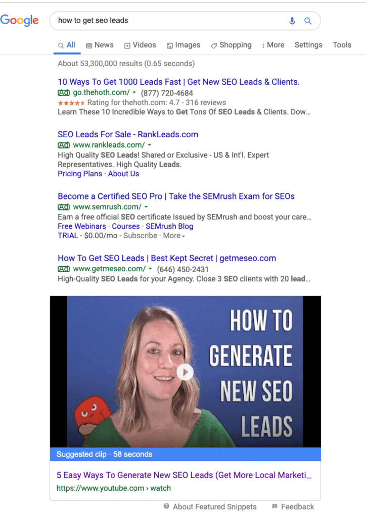 Google is now including video snippets in the search results - and often right at the top of search results. If you’re trying to rank your website for a competitive phrase, it can pay off to create a video for the same topic. Not only can you rank on YouTube (more on that later), Google will often feature videos at the top of the search results. Here’s an example of one of the videos that ranks for a valuable keyword: Keyword: how to get seo leads