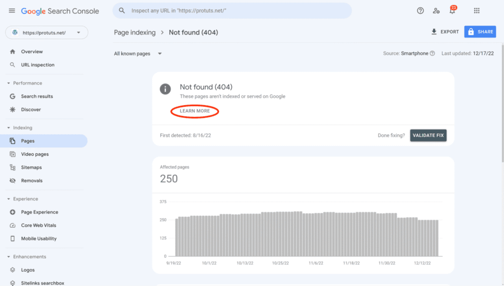 As you can see in this example, 250 entire web pages aren’t getting indexed due to 404 Not Found errors. That’s a lot of broken links, but it’s not unheard of for a larger website to have that many (or more).