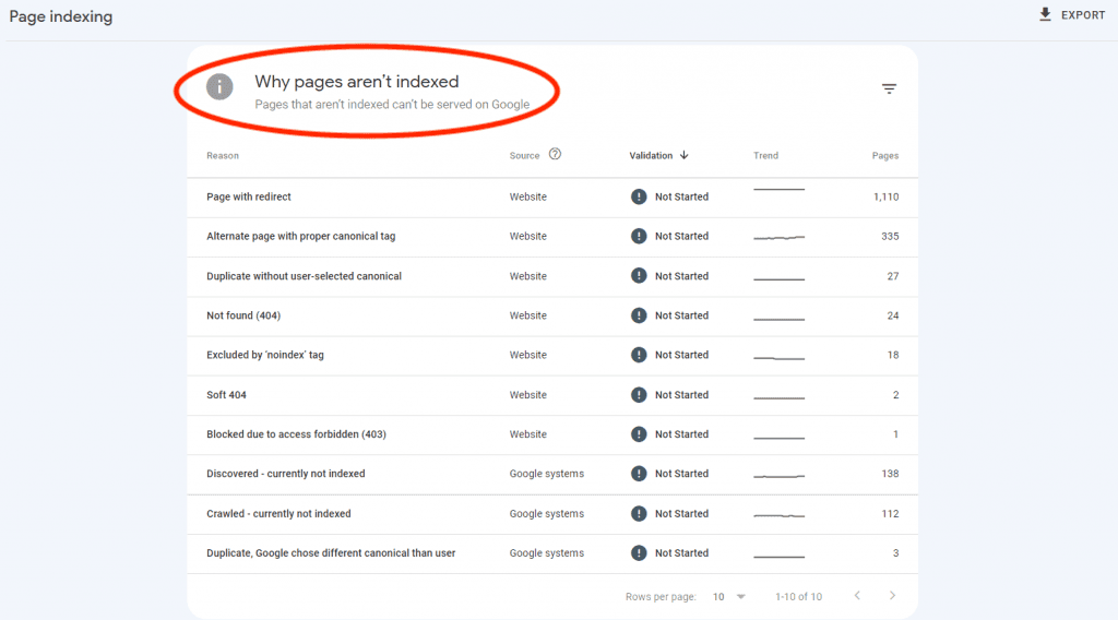 If you keep scrolling down the page, you’ll see a section titled Why pages aren’t indexed, which will contain a complete list of any indexing errors you currently have.