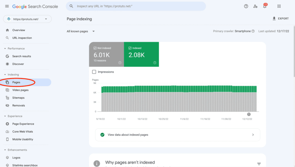 At the top of the page, you get to view how many of your web pages Google has indexed vs. not indexed, which is a handy way to eyeball how much of your website is indexed.