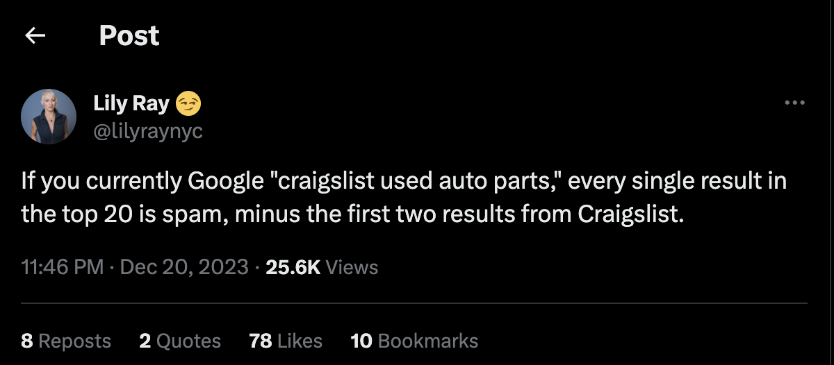 On December 20th, 2023, X user Lily Ray made a startling discovery on Google’s search results.