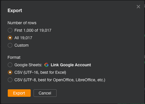 This will direct you to the export options pop-up window. You’ll have CSV options that work best for Microsoft Excel and OpenOffice, so select the one that will work best for you.