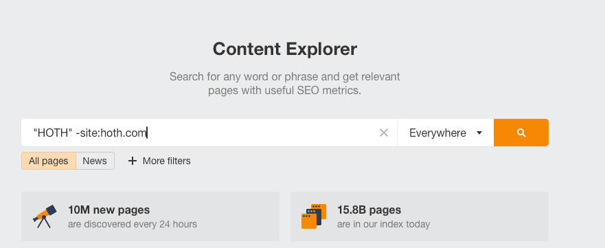 There are times when another website mentions your brand but doesn’t include a link back to your site. While the brand recognition is nice, adding a backlink would make the shout-out a thousand times stronger. Luckily, you can use Ahrefs to track down unlinked brand mentions so that you can request a backlink via outreach. Here’s how to do it using the Content Explorer tool (located in the top navigation bar):