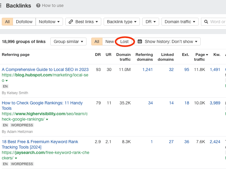Next, you need to set up notifications to let you know whenever you gain or lose a backlink. That way, you’ll be able to fix broken links as soon as they appear. You’ll also quickly find out if a site owner removed one of your backlinks, either by mistake or because they chose to use another link instead (in which case you could reach out to them to try to re-establish the link). Using Ahrefs, you can quickly view all your broken links in the Backlinks report. Once there, select the Lost filter at the top of the page: