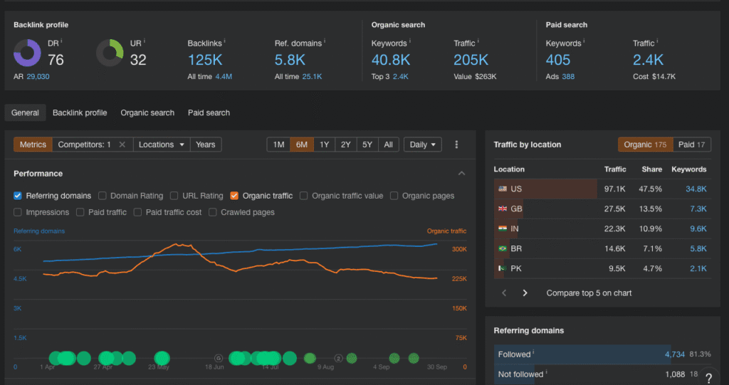 2. This will take you to the Overview page where you will see a screenshot of your competitor’s SEO performance, including organic traffic, backlinks, and top-performing pages.
