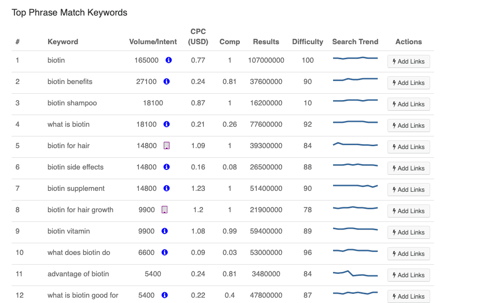 In the example provided, ‘biotin for hair’ and ‘biotin for hair growth’ are both high-intent keywords and the rest are informational.