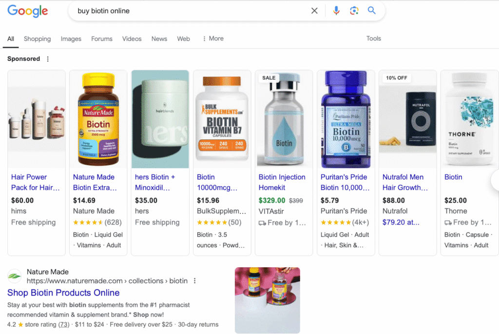 It’s a feature that only appears for transactional keywords, and the rest of the organic results are all product pages for Biotin supplements, which further proves our point.