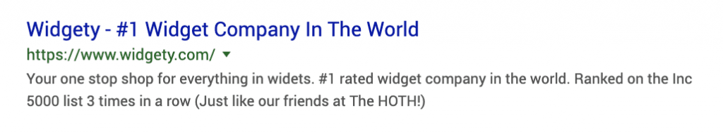 Most businesses start out only offering a handful of products, and then gradually expand their lineup as they scale their operations. What does this have to do with optimizing your homepage? It’s relevant because most new websites will try to rank their homepages for keywords closely related to their flagship products and services. This means that when they eventually expand, they try to cram a ton of new keywords into their homepage, which causes a huge mess. Here’s an example of what we’re talking about. Let’s say that you start a new business that sells blue widgets in New York. Since you only sell one product, you optimize your homepage for it: