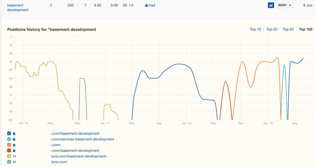 This is a screenshot from Ahrefs (an SEO tracking tool). Each colored graph represents a different page on the site.