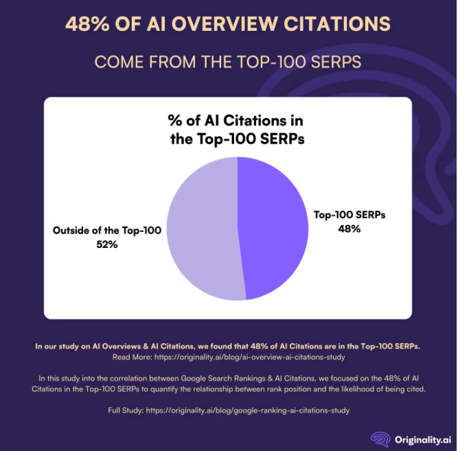 In fact, research from Originality.ai shows that 52% of AI citations originate from outside the top-100 ranked organic results: