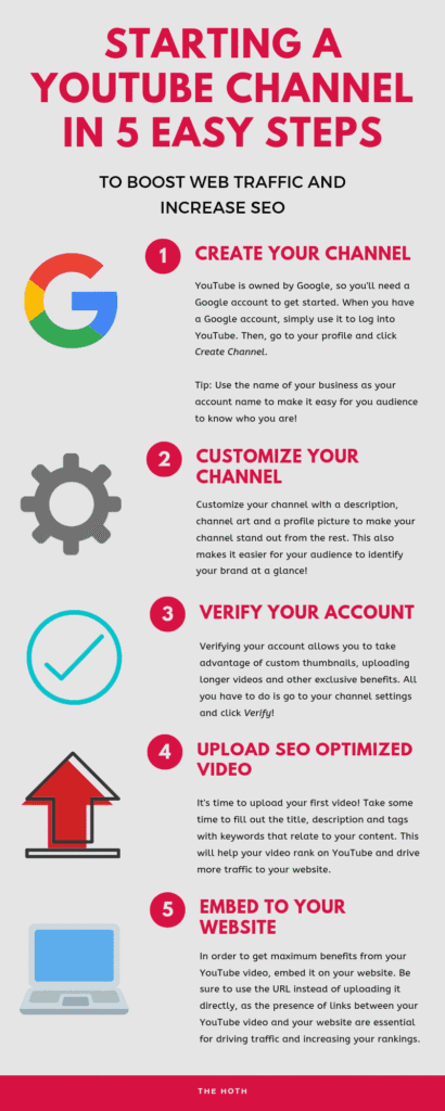 YouTube is the second-largest search engine in the world, with over 2 billion active monthly users. This is a huge audience that you may not be taking advantage of yet. By uploading your videos to YouTube, you’ll tap into an entirely new traffic source. If you can succeed on Youtube, then your brand is sure to follow. If you are linking back to your website with each upload, you can get a huge increase in traffic through YouTube alone. In fact, Brian Dean of Backlinko performed a study and analyzed 1.3 million Youtube videos. The findings resulted in a realization that comment count, number of videos, number of shares, and likes are all connected with higher Youtube rankings. In the same study, Brian Dean also found that videos that ranked on the top page of Youtube results had an average video length of 14 minutes and 50 seconds. That supports the concept that long-form content is great for video SEO as well as article length. Not sure how to get started with YouTube? Don’t worry. We’ve got a simple step-by-step guide for you.