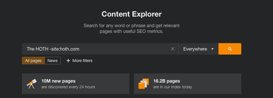 There are times when writers mention a brand online but don’t include a link back to their website. These are called unlinked brand mentions, and with some detective work and outreach, you can turn them into backlinks. Here’s how to find them using Ahrefs. Using the Content Explorer tool, enter your brand name plus the formula ‘-site:yoursite.com’ to ensure your web pages don’t appear in the results: