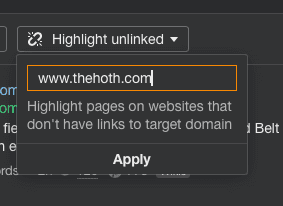 Hitting the search button will provide a list of all our brand mentions online. However, we want to take things a step further by only highlighting the unlinked mentions, which you can do by selecting this filter: