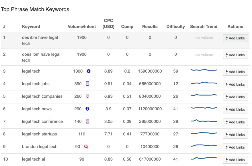 Here’s a quick example of how to use our keyword tool to find legal keywords for your guest posts. Let’s say that you want to write a guest post for Legal Insider, the legal tech news website we mentioned earlier. Using our keyword tool, you could enter something like ‘legal tech’ to see what’s trending: