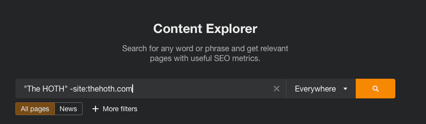 The last outreach-based technique we’ll look into is targeting unlinked brand mentions. What are those? An unlinked brand mention occurs whenever another website mentions your brand but fails to include a backlink to your site. While it’s still great that they mentioned your law firm’s name on their website, the shout-out would mean a lot more if they hyperlinked it! The good news is there’s nothing stopping you from hunting down your unlinked brand mentions and turning them into linked brand mentions. Here’s how to hunt them down:- Ahrefs (paid method). If you have access to Ahrefs, you can use its Content Explorer tool to find unlinked mentions. Enter your brand name in quotes, and then use this formula to ensure your own website doesn’t appear in the results: -site:(yoursite).com