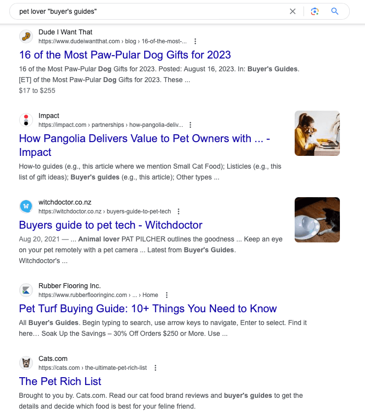 Now that you know the metrics required for vetting the quality of websites, here’s a trick for finding relevant websites in your field. Google is your best friend in this regard, as you can use the basic search operator formula (wrapping a keyword in quotations) to hunt down link insertion opportunities. For example, let’s say you run a website that sells pet supplies, and you want to build link insertions that point toward some of your product pages. In that case, buyer’s guides on pet lover websites are what you need to find, so you could search on Google for phrases like pet lover “buyer’s guides.” Here’s what that looks like: