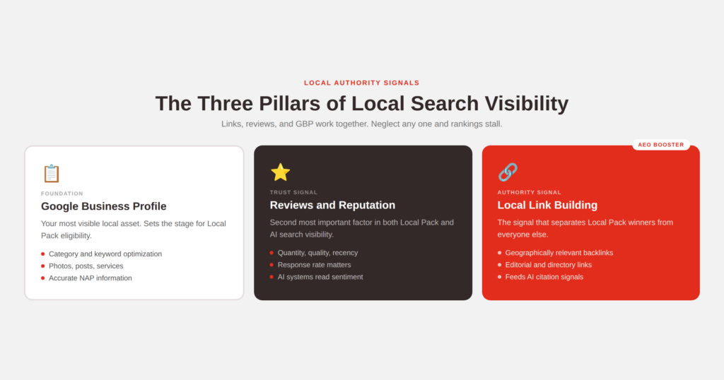 Local link building builds the authority signals that determine whether Google and AI systems trust your business enough to recommend it. Reviews build the trust signals that determine whether customers and AI systems trust your business enough to cite it as the best option.