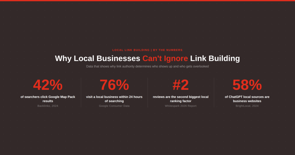 Whitespark’s 2026 report confirms that domain strength, review signals, and brand mention consistency now determine visibility across Google, Maps, ChatGPT, Perplexity, and Apple Maps simultaneously. Local link building feeds all of them.