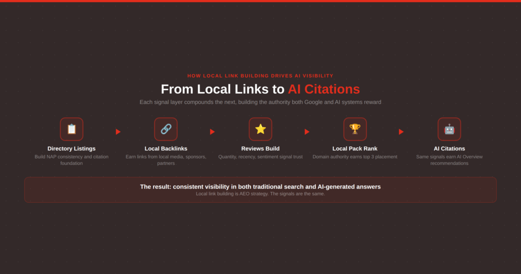 In other words, the same signals that help you rank in the Local Pack are the signals that help you get cited in AI search. Local link building is no longer just an SEO tactic. It’s an AEO tactic too.