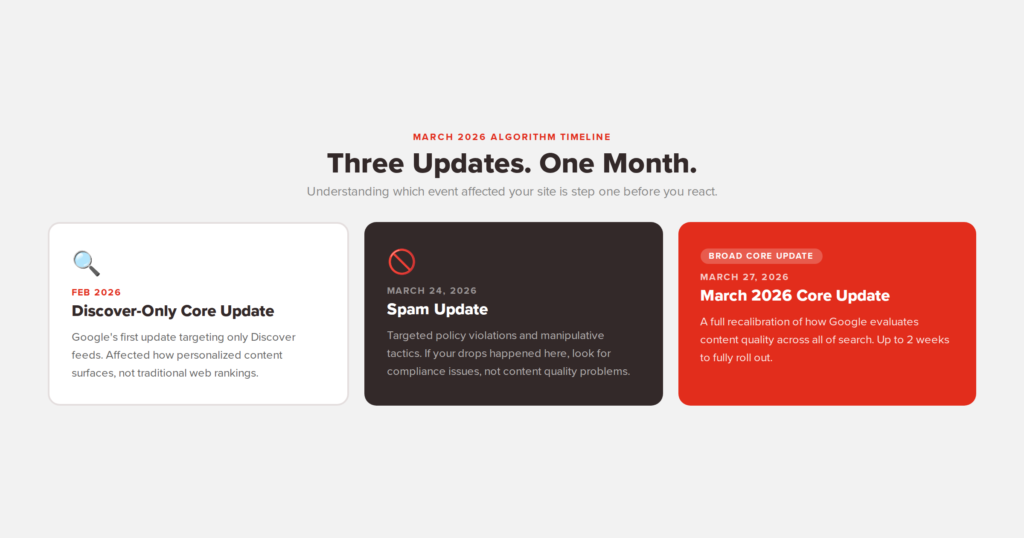 The March 2026 core update didn’t arrive in isolation. Before it rolled out, Google wrapped up a spam update on March 24 and had already completed a Discover-focused core update in February. That’s a notable cluster of activity.