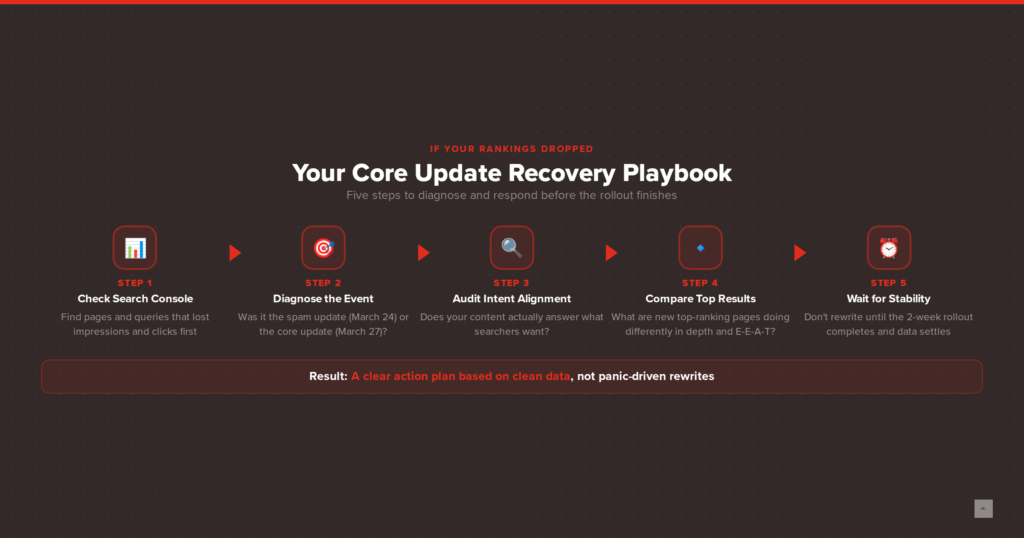 • Check your spam update exposure separately. If your drops coincided with the March 24 spam update, the issue may be a policy violation rather than a quality issue.