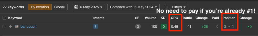 Ranking #1 for a keyword organically means you don’t have to pay a keyword’s CPC, like this one, for example: