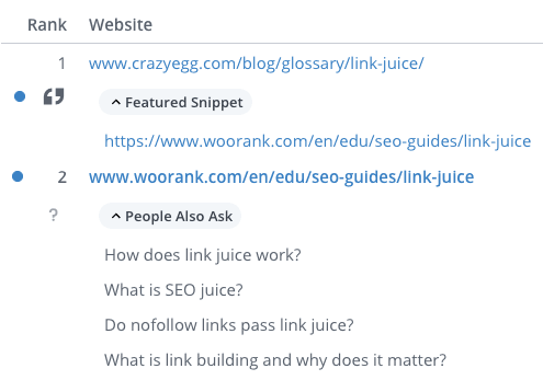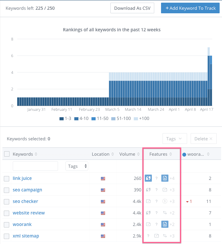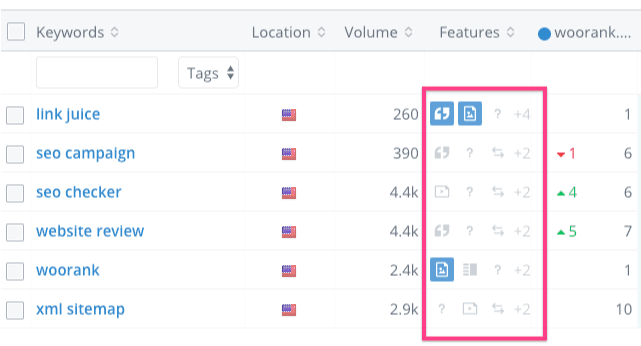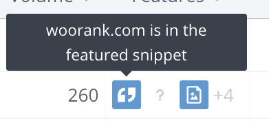 Another technique is to use a keyword research tool that displays SERP feature data. For this, we recommend using WooRank's Keyword Tool. It will let you know if a keyword is likely to show up in a featured snippet or not.