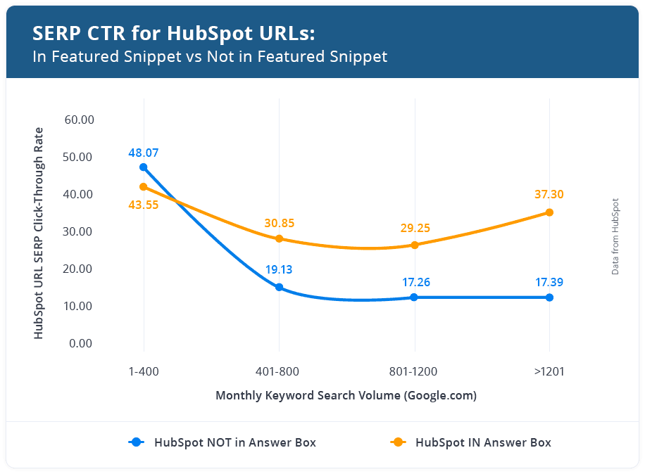 These benefits should change your mind if you're on the fence about optimizing for featured snippets. Primarily, any web page containing a featured snippet will have a higher CTR than one without. In fact, Hubspot found that, on average, content containing a featured snippet will have a 2x higher CTR than unfeatured content.