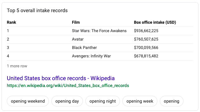 For the most part, table snippets are reserved for queries related to statistics and figures. An example would be searching crime rates for a particular city.